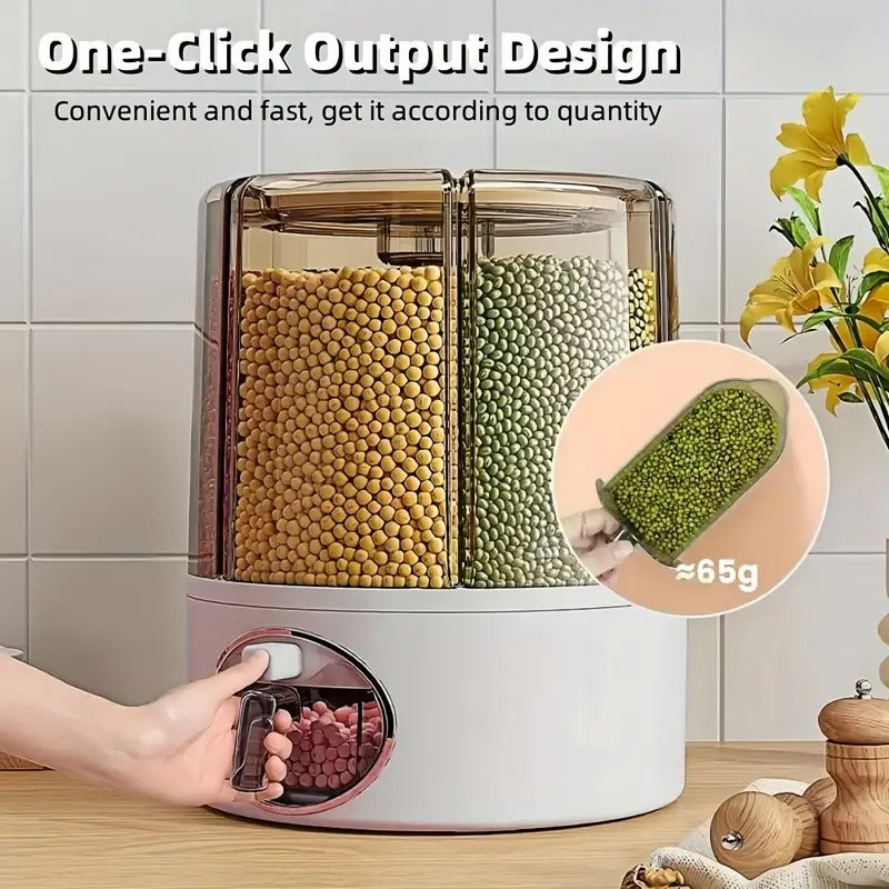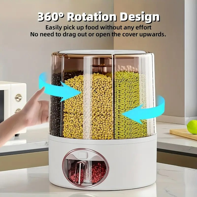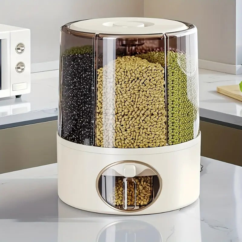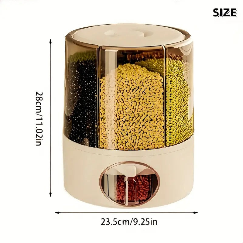 Keep your kitchen or pantry neat and organized with this 360° rotating rice and grain dispenser. Designed with six separate compartments, it lets you store and access different types of rice, beans, grains, or even pet food—all in one space-saving container.