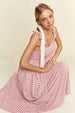 This smocked sleeveless maxi cami dress is a perfect blend of comfort and style. The smocked bodice provides a flattering and figure-hugging silhouette, while allowing for ease of movement. The sleeveless design and maxi length add a breezy and effortless feel, making it a versatile piece for casual outings or summer events. Whether dressed up with accessories or worn on its own, this cami dress is sure to become a go-to favorite in your wardrobe.