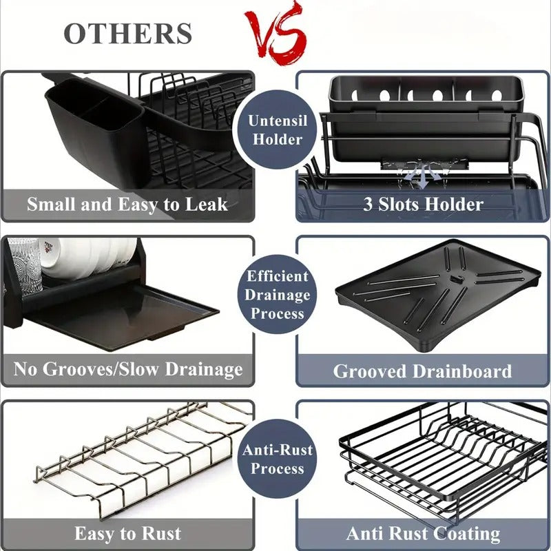Keep your kitchen counter clean and organized with this Extra Large Dish Drying Rack. Designed for convenience, it features a built-in auto-draining system with a 360° rotating spout that directs water straight into the sink — no mess, no puddles.