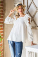 Elevate your look with this ruffle trim cold shoulder Swiss dot blouse. The ruffle trim detailing adds a feminine and elegant touch to the blouse. The cold shoulder design is trendy and chic, perfect for showing off a little skin. The Swiss dot fabric adds texture and visual interest to the top. Pair with pants or a skirt for a stylish and sophisticated outfit. Embrace a fashion-forward style with this unique and flattering blouse.