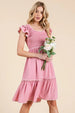 Make a stylish statement with this solid ruffle trim smocked dress featuring a contrast design. The ruffle trim adds a feminine touch to the dress. The smocked detailing offers a flattering and comfortable fit. The contrast design adds a unique and eye-catching element to the dress. Perfect for a special occasion or a chic daytime look. Embrace a fashionable and trendy style with this versatile and flattering dress.