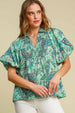 Umgee Full Size Woven Abstract Print Johnny Collar Puff Sleeve Blouse Plus Size